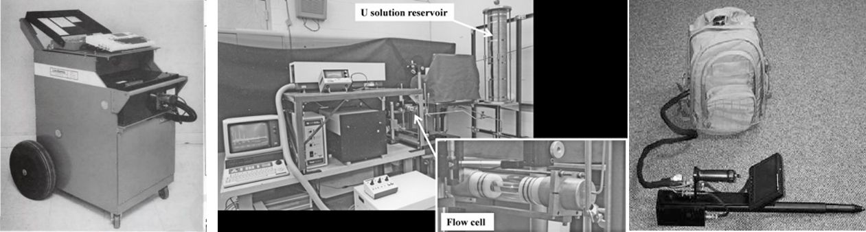 上世纪80年代开始,美国洛斯阿拉莫斯实验室(LANL)就尝试利用激光等离子体光谱开展工作场所气溶胶有害成份和硝酸铀等涉核物质的原位探测(图4)。他们建立的实验室装置对气溶胶中铍元素的直接探测的灵敏度接近0.6 ppb,相当于每立方米空气中的铍含量接近0.8μg。实验装置对铀溶液的探测限也达到了100mg/L,相当于100 ppm。同一时期,他们还尝试开展了工业(熔盐)及环境介质(土壤)中痕量涉核元素的探测。这些工作充分展示了LIPS技术在现场适应性、灵敏度、探测效率等方面的潜力,并为现场应用装备的开发奠定了基础。