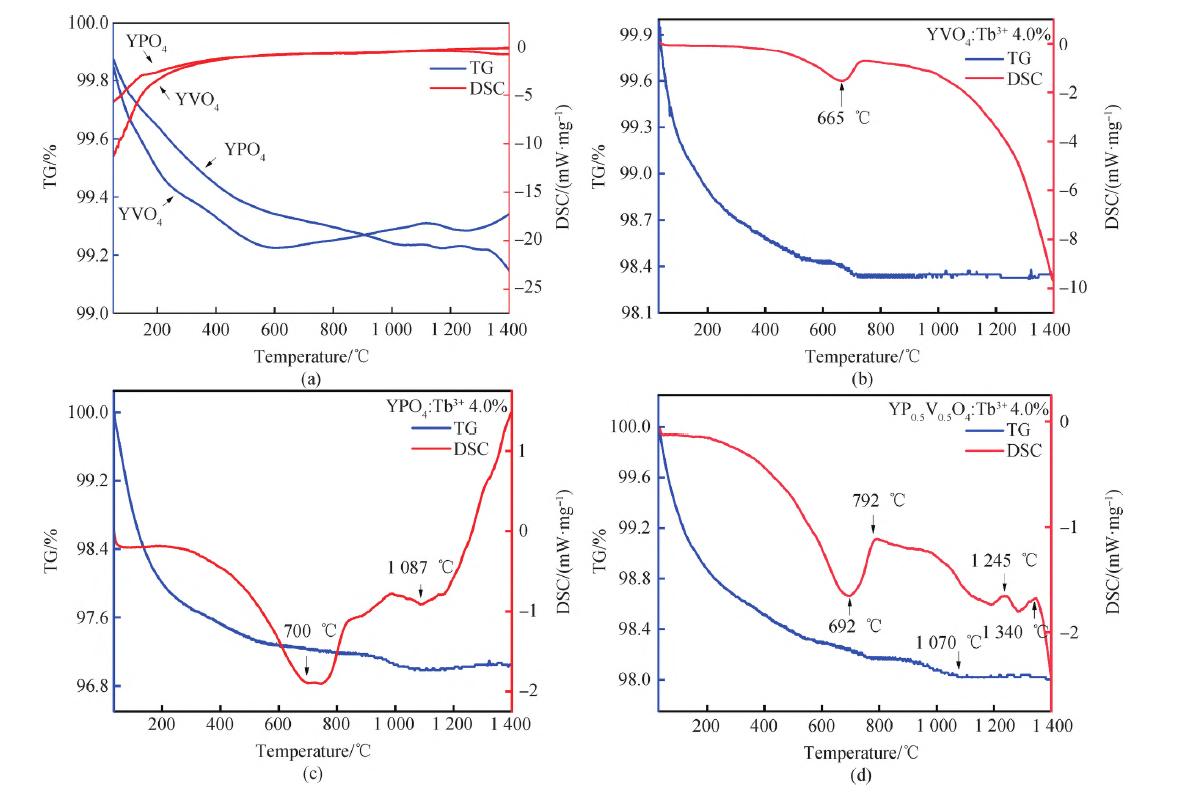 图1 YVO4 与YPO4 (a)、YVO4∶Tb3+(b)、YPO4∶Tb3+ (c)及YV0.5P0.5O4∶Tb3+(d)的TG-DSC 曲线