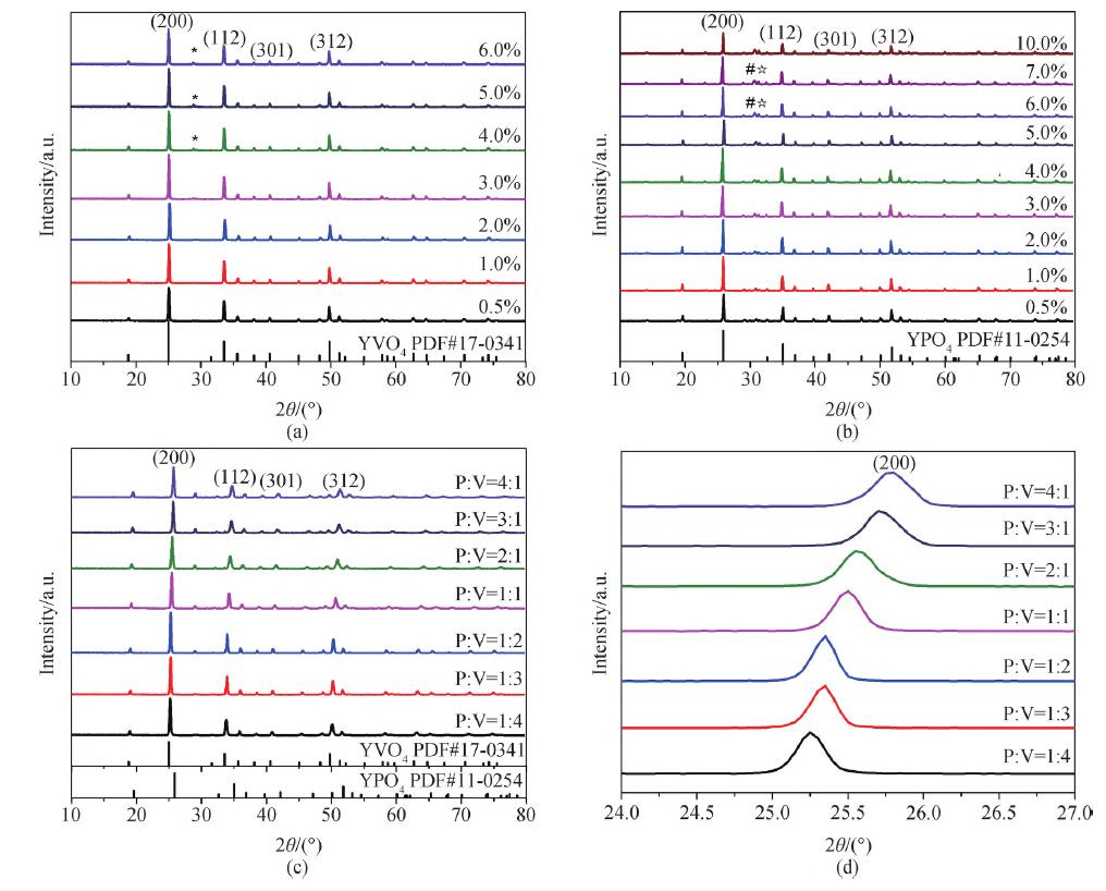 图2 样品的XRD 图谱。(a) YVO4∶Tb3+ ;(b) YVO4∶Tb3+;(c)YV1-xPxO4∶Tb3+;(d) YV1-xPxO4∶Tb3+ (200)晶面衍射峰
