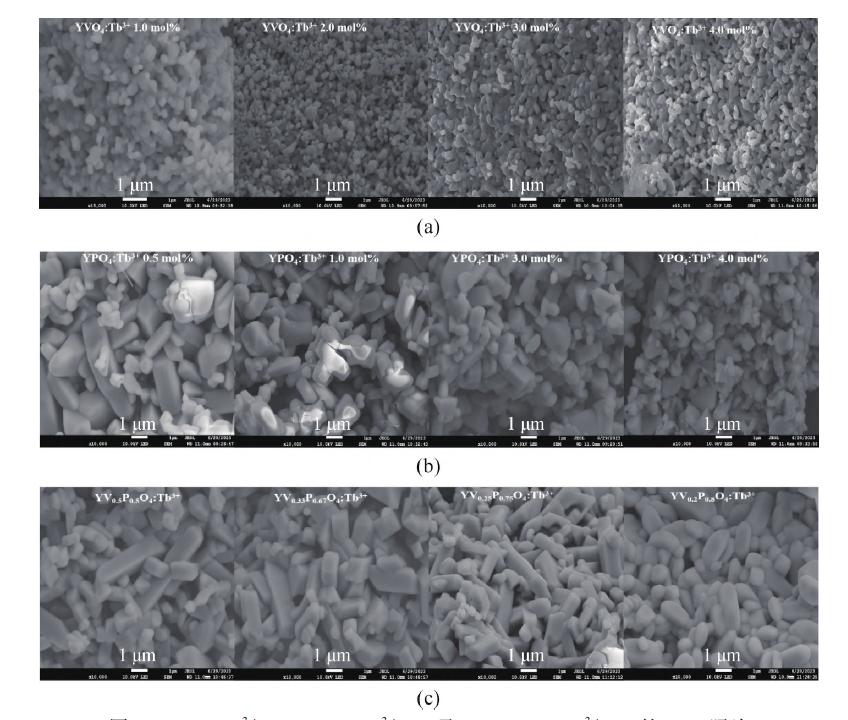 图3 YVO4∶Tb3+ (a)、YPO4∶Tb3+ (b)及YV1-xPxO4∶Tb3+ (c)的SEM 照片