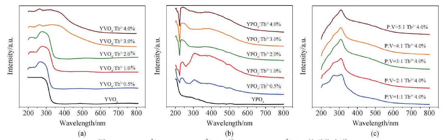 图5 YVO4∶Tb3+ (a) YPO4∶Tb3+ (b)、及YV1-xPxO4∶Tb3+(c)的吸收光谱