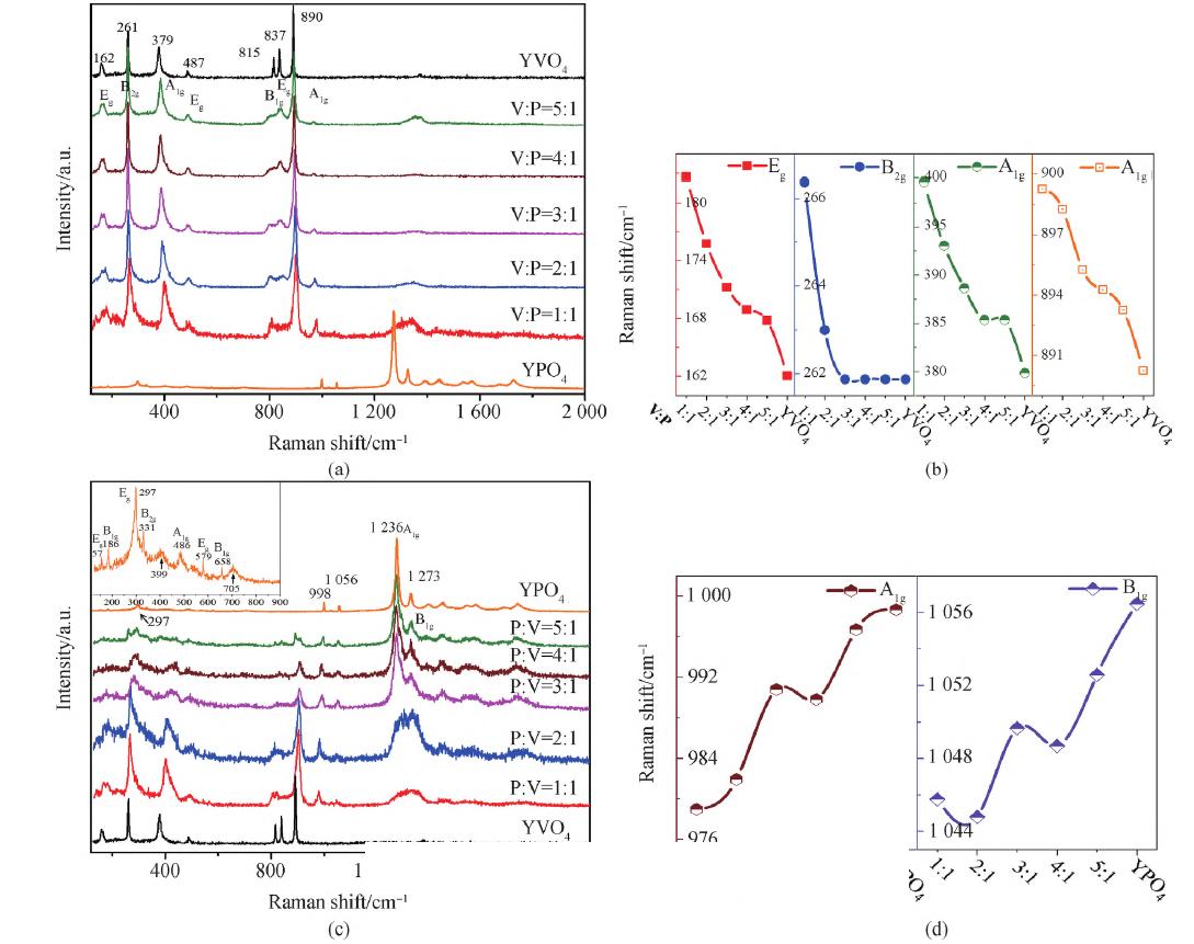 为分析样品声子能量分布,采用北京卓立汉光仪器有限公司生产的 Finder 930全自动激光显微共聚焦拉曼光谱仪测试了荧光粉样品的拉曼光谱(图6), YVO4、YPO4的原胞均在布里渊区中心产生12个拉曼活性声子分支,具有相同振动模式, YV1-xPxO4中振动频率在998 cm-1 的散射峰对应YPO4 的A1g (2)特征峰,其余可辨散射峰均为YVO4的特征峰。YVO4的Eg (2)、B2g、A1g(1)和A1g(2)四个内模散射峰位随V:P比例增加向低波数方向移动,如图6(b)所示,表明VO4四面体中V—O平均键长随V含量增加而变长,V—O键振动频率降低,特征峰形向高波数呈现非对称性展宽源于声子限制效应, YV1-xPxO4晶格完整性及平移对称性较YVO4 有所降低,参与拉曼散射声子数量增加,谱峰出现拖尾展宽现象。YPO4及不同P:V =比例YV1-xPxO4的拉曼散射如图6(c)所示,左上插图为YPO4在120 ~900cm-1 拉曼散射放大图。图中除B1g(2)外,YPO4其余11个征散射峰全部观测到。YPO4中399 和705cm-1 处非特征的拉曼散射峰,可能是因为局域晶格畸变产生了非本征YPO4的拉曼散射。YPO4中大于1200cm-1高能声子可能涉及到更高一级的拉曼散射效应。YV1-xPxO4中VO4四面体内模振动显著,P:V为5:1时,VO4四面体内模振动影响依然存在,频率低于900 cm-1,依然难以分辨YPO4内模振动。YPO4高频内模振动A1g(2)、B1g(4)随P:V变化如图6(d)所示,表明PO4四面体中P—O平均键长随P含量增加而变短,P—O键振动频率增加。综上,YVO4 的拉曼频谱分布不均匀,*大声子能量集中在815~890cm-1、500~800cm-1。YPO4一阶拉曼频谱分布较为均匀,内模振动声子能量接近。调整V:P比例,一定范围内可有效调控YV1-xPxO4声子能量分布,从而调整材料的无辐射弛豫速率。