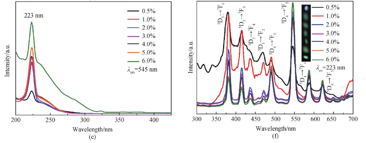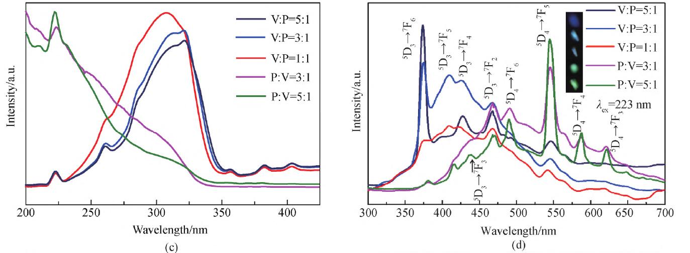 图7(b)表明YVO4本征发光为蓝光,发光中心位于433 nm 处,对应于VO43- 激发态3T2→1A1和3T1→1A1跃迁。YVO4:Tb3+射光谱包含VO43-本征发光带和Tb3+的5D3→7F6(373 nm)、5D3→7F4 (428 nm)、5D3→7F2 (468 nm)及5D43→7F5 (545 nm)跃迁发光, Tb3+发光以5D3发光为主。图7c表明P元素比例增加,VO43- 的电荷迁移跃迁吸收带消失, Tb3+的基态7F到激发态7D的f-d 跃迁占据主导。图5d表明随P元素增加,发射光谱呈现由蓝到绿转变,表明基质组分对Tb3+发光具有一定调控作用。图7(f)插图展现了掺杂浓度对发光的调节作用,随Tb3+掺杂浓度增加,发光由青光变为绿光。