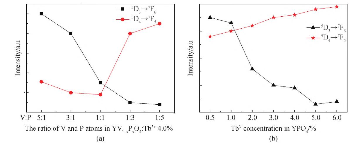 图8 5D3→7F6和的5D4→7F5发光相对强度随基质组分(a)、掺杂浓度变化(b)
