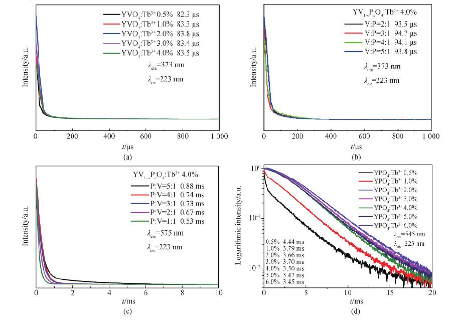 图9 YVO4:Tb3+ (a)和YV1-xPxO4:Tb3+ (b)在373nm发射波长监测下荧光衰减曲线, YV1-xPxO4:Tb3+ (c)和YV1-xPxO4:Tb3+ (d)在545 nm 发射波长监测下荧光衰减曲线