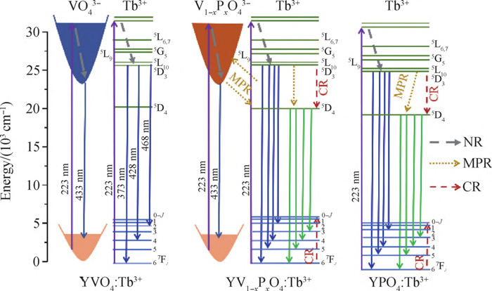 分析发光机理,测试了223 nm 激发下荧光粉的荧光衰减曲线,如图9 所示。计算了有效寿命τ,得到YVO4:Tb3+荧光寿命约为83 μs,掺杂浓度对荧光寿命影响较小,V元素占比高于P元素,发光以5D3→7F6能级跃迁发光为主,荧光寿命约为94μs; 当P元素占比高于V元素, 5D3→7F6能级跃迁发光减弱甚至消失, 5D4→7FJ能级跃迁发光增强,随P:V由1:1增至5:1,荧光寿命随P元素含量增大而增加,从0.53 ms 增加至0.88 ms。YPO4: 5D4中随Tb3+浓度增加,5D3蓝光发射比例减小,5D4绿光发射比例增加,材料发光呈现由青光向绿光的变化。5D4→7F5荧光衰减曲线随Tb3+浓度的变化情况如图9(d)所示。掺杂浓度由0. 5% 增加至6.0%, Tb3+间距离缩短,更多电子通过该通道被布居到5D4能级电子数目增多,荧光寿命从4.44 ms 降至3.45 ms。发光机理如图10所示。调节YVO4和YPO4基质组分及5D4掺杂浓度,通过无辐射跃迁、MPR 和CR多过程作用,可以改变Tb3+掺杂钒磷酸盐发光色度,实现由蓝到绿的发光调节。