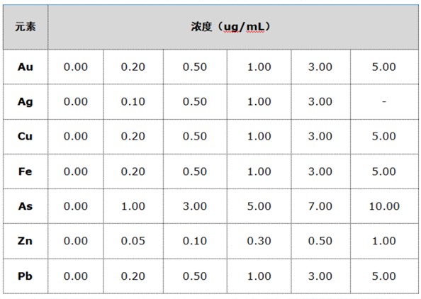 按下表配制各元素的系列标准溶液,待仪器工作稳定后,依次进样,根据浓度和吸光度,绘制标准曲线。