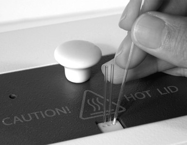 在将任何毛细管放入样品槽之前,确保OptiMelt熔点分析仪已接电和设置初始温度低于样品预期熔点温度。