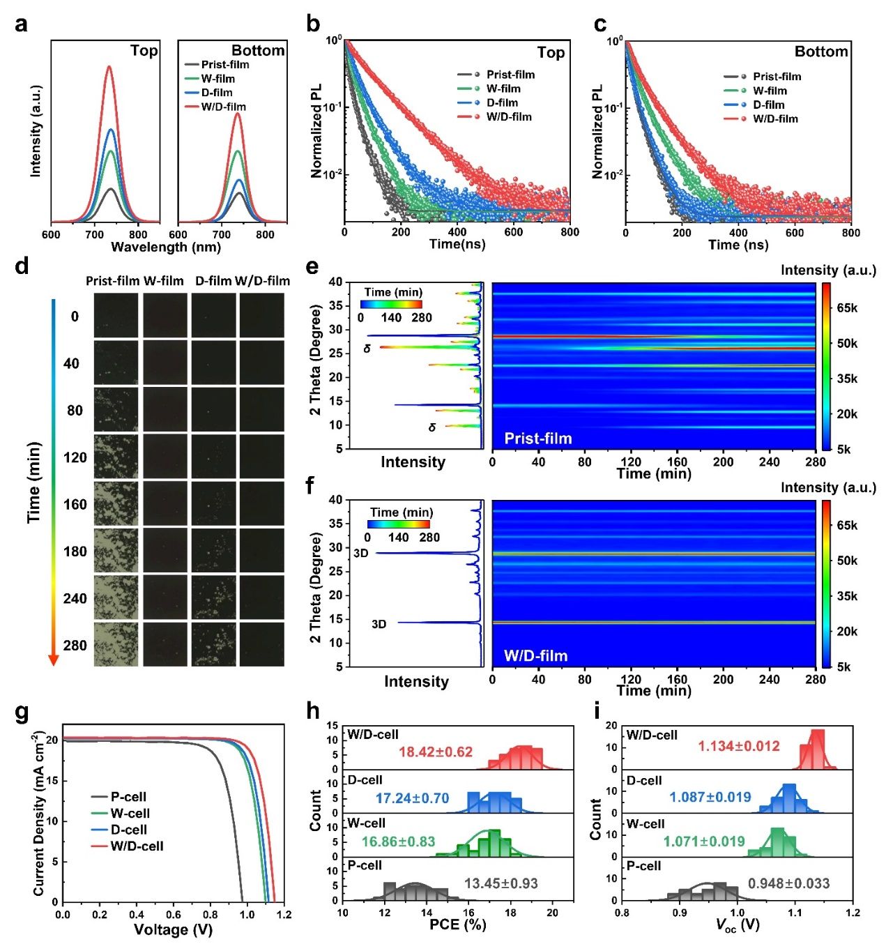 PL测试结果表明,干膜处理更有利于钝化钙钛矿薄膜的表面缺陷,而湿膜处理由于ChI的高渗透性更有利于钝化钙钛矿薄膜的体缺陷。为此,采用湿膜处理结合干膜处理的综合策略来获得W/D-film,以实现对CsPbI3薄膜表面和体缺陷的更有效的钝化。另外,湿膜处理过程中Ch+渗透到整个钙钛矿薄膜中并得到稳定的ChPbI3,抑制体相中δ相的形成,提高了钙钛矿相的稳定性。基于综合策略下组装的C-PSC获得了18.42%的冠*效率。