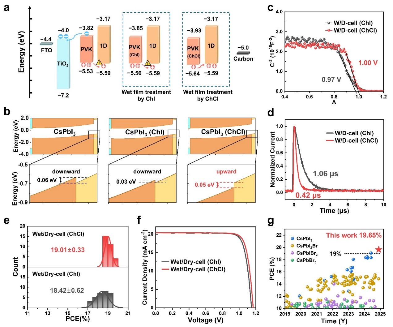 进一步的,作者发现,在湿膜处理过程中用ChCl代替ChI,能够将钙钛矿/碳界面从向下变为向上的能带弯曲,优化了能级结构,消除了空穴提取势垒,提高了载流子提取效率。*终获得的CsPbI3 C-PSC的效率达到 19.65%,创下了无机 C-PSC 的新纪录。