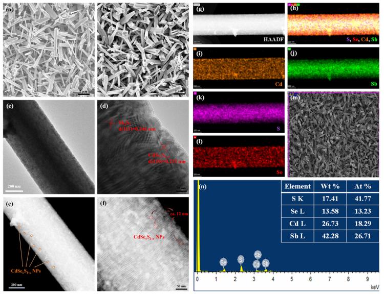 图1 (a) Sb2S3纳米棒的SEM图像,(b) Sb2S3@CdSexS1-x光电极的SEM图像,(c) TEM图像,(d) 高分辨TEM图像,(e, f) HAADF图像,(g–l) Cd、Sb、S和Se的元素分布图,以及(m, n) Sb2S3@CdSexS1-x光电极的EDS光谱。