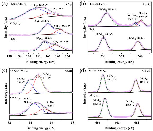 图2 (a) S 2p,(b) Sb 3d,(c) Se 3d和(d) Cd 3d的高分辨率XPS光谱,分别对应于Sb2S3、CdSexS1-x和Sb2S3@CdSexS1-x光电极。