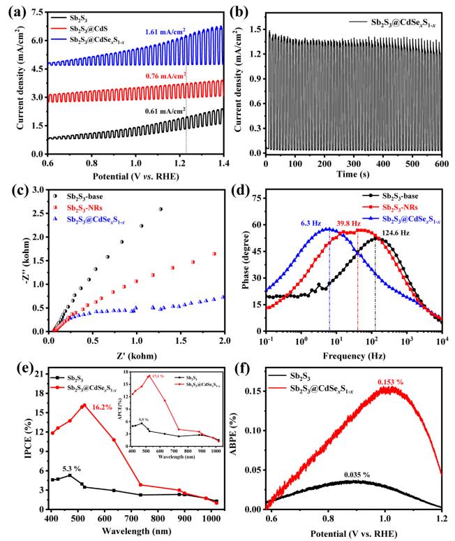 图3. (a) Sb2S3和Sb2S3@CdSexS1-x的LSV曲线,(b) LIT曲线,(c) Nyquist图,(d) Bode相位曲线,(e) IPCE和APCE,以及(f) ABPE光谱。