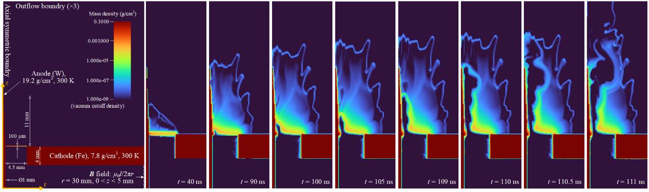 本研究聚焦金属丝短接的RPD(wire-shorted RPD, WS-RPD),其较之于真空间隙的RPD,阴阳极间由金属丝短接,在脉冲大电流通入后发生金属丝电爆炸(electrical wire explosion, EWE)产生等离子体预短路电极间隙。研究团队发现,相较于等离子体填充RPD,WS-RPD中的EWE等离子体在X射线辐射阶段仍然具有显著的拖尾质量,而仅有靠近阳极的一小部分等离子体被推向阳极杆尖*。此外,该结构中的电子束源区域较大,电子从较大的阴极区域发射,并在电场力作用下加速,在自磁场作用下聚焦。