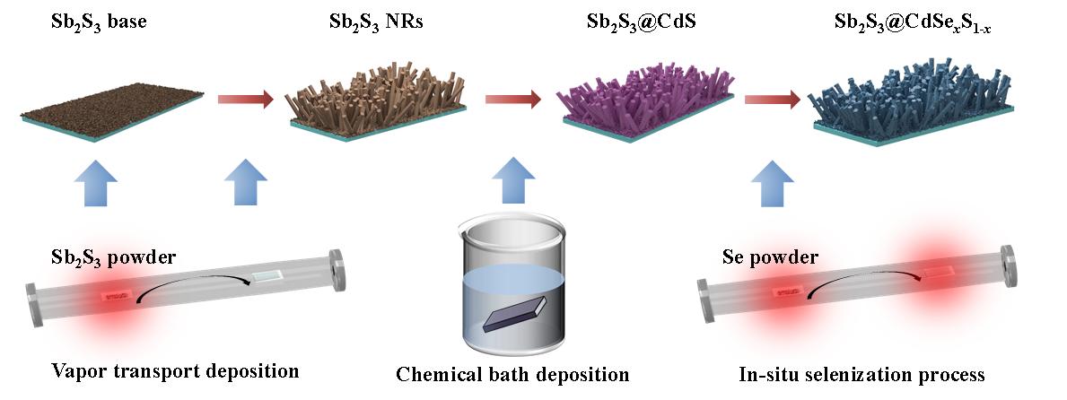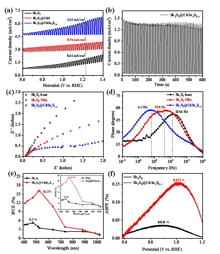 研究结果表明:本工作采用两步气相输运沉积结合化学浴沉积和原位硒化策略,在Sb2S3纳米棒光电极表面成功构建准一维S型Sb2S3@CdSexS1-x异质结,有效抑制了Sb2S3深能级缺陷导致其光生载流子严重复合的弊端,实现光生载流子高效分离。此外原位硒化有助于光电化学性能与稳定性的提升。研究结果为开发和设计高效稳定的Sb2S3基光电器件提供了有效的策略。
