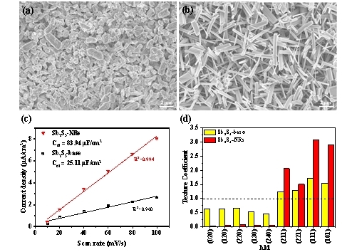 图2(a)Sb2S3 base和(b)Sb2S3 NRs的SEM图;(c)双电层电容测试图和(d)晶格纹理系数图
