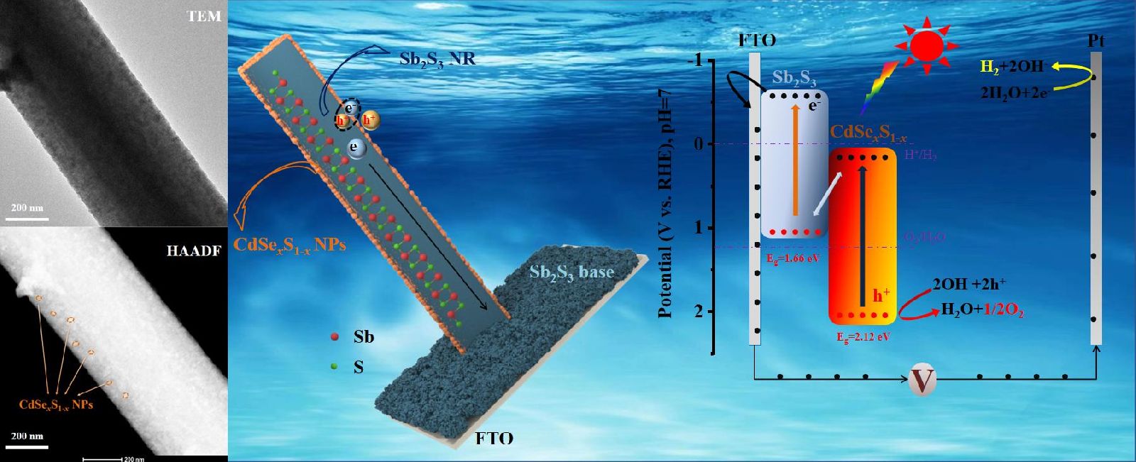 近日,西北大学苗慧课题组在原位生长构筑Sb2S3@CdSexS1-x准一维S型异质结光阳极及其光电化学特性研究方面取得进展,研究成果以“Fabricating S-scheme Sb2S3@CdSexS1-x quasi-one-dimensional heterojunction photoanodes by in-situ growth strategy towards photoelectrochemical water splitting”为题发表在国际期刊Journal of Materials Science & Technology。西北大学物理学院为该论文*一单位,刘康德博士研究生为*一作者,苗慧教授为通讯作者。今天小卓为大家分享该研究成果,希望对您在纳米异质结器件光电性质研究方面带来一些灵感和启发。