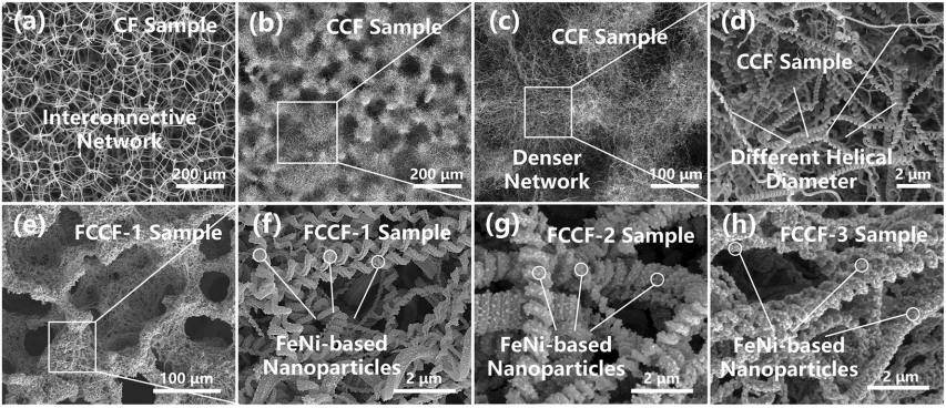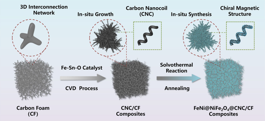 构建基于碳纳米线圈(CNC)的手性-介电-磁三位一体复合材料被认为是实现优异低频微波吸收的一种有前途的方法。然而,进一步增强低频微波吸收和阐明相关损耗机制仍然是一个挑战。近日,大连理工大学物理学院潘路军教授团队在《Nano-Micro Letters》期刊发表题为《Multifunctional Carbon Foam with Nanoscale Chiral Magnetic Heterostructures for Broadband Microwave Absorption in Low Frequency》的研究论文。