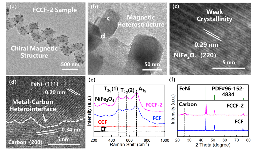 FCCF复合材料的TEM图像如图3a-d所示,FCCF复合材料的拉曼光谱如图3e,图2S(b,c)所示, CF和CCF样品在0-1000 cm-1区域没有拉曼峰。对于FCCF和FCF复合材料,FeNi基粒子的引入导致在480 cm-1、570 cm-1和683cm-1处出现三个主峰,对应于NiFe2O4的T2g(1)、T2g(2)和A1g振动模式。拉曼光谱结果进一步证实了FeNi基颗粒中存在NiFe2O4,这与TEM图像一致。FCCF-1和FCCF-3样品的XRD图和拉曼光谱与FCCF-2样品的XRD图和拉曼光谱高度一致,表明FCCF-1及FCCF-3中也合成了FeNi/ NiFe2O4磁性异质结构,成功建立了具有手性磁性单元的3D互连网络。