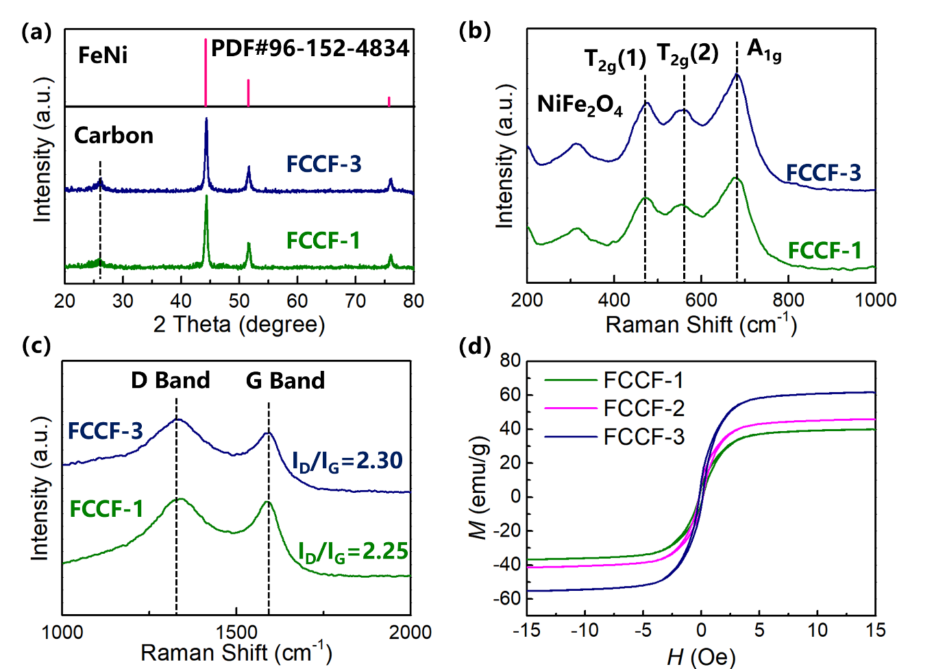 图三:FCCF复合材料的TEM图像、拉曼光谱和XRD谱图。