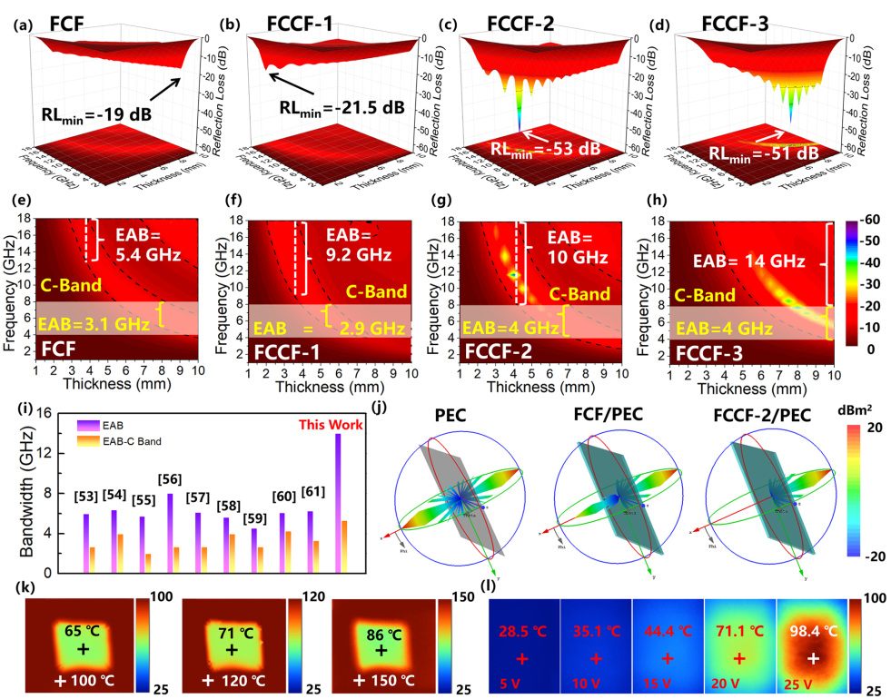图四:CCF和FCCF复合材料的微波吸收性能及多功能特性。