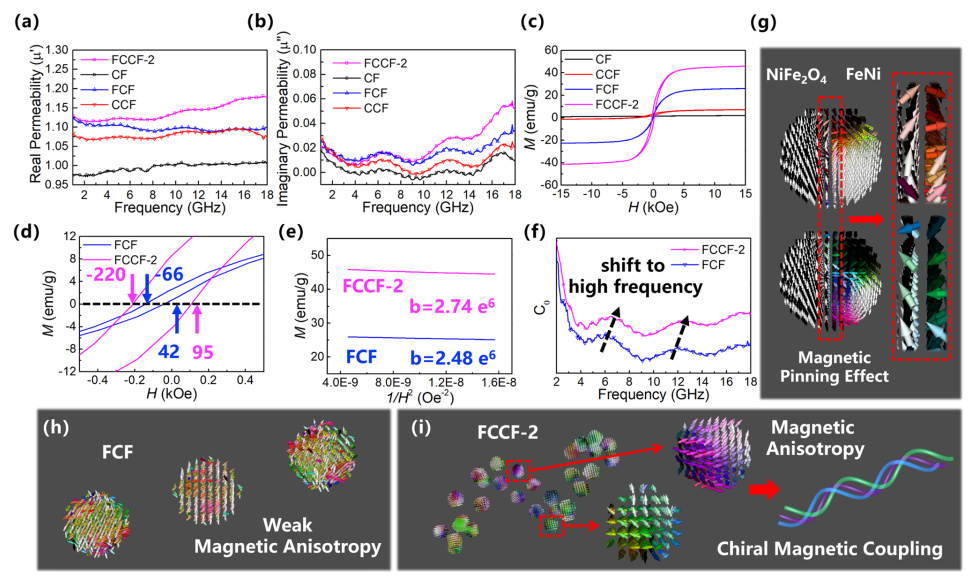 图六:CCF和FCCF复合材料的磁导率分析及微磁学模拟图。