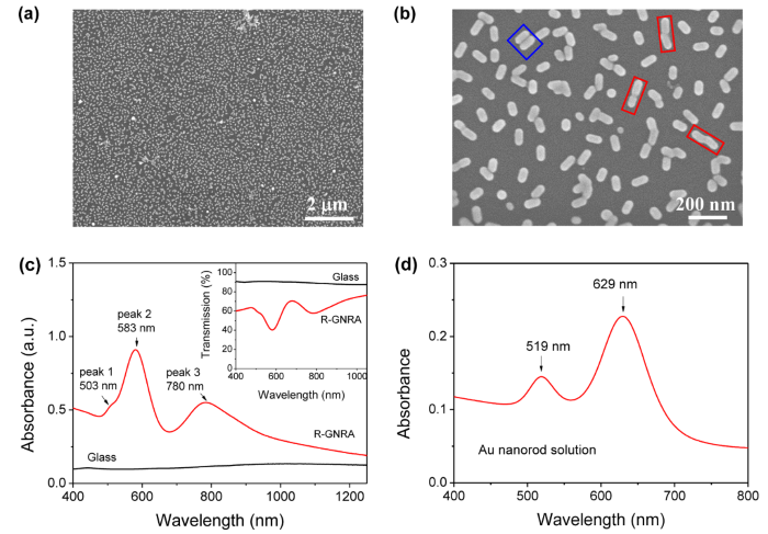 (c) R-GNRA的吸光度和透射光谱,780 nm峰源自纳米棒耦合。