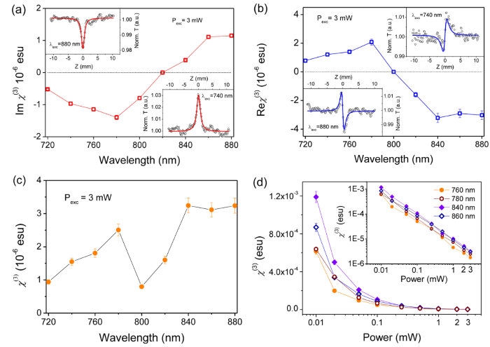 (d) 不同波长下χ³的功率依赖性(10 μW-3 mW)。