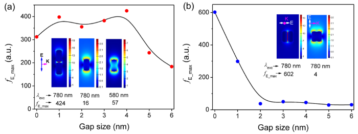 (a) 端对端排列纳米棒二聚体的电场增强因子(f)随间隙变化,插图为1 nm间隙的电场分布。