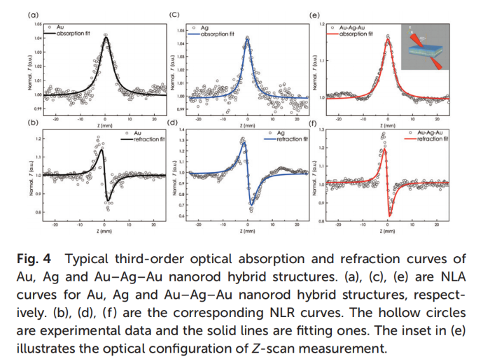 同时,使用钛宝石激光器作为光源,脉冲宽度为130 fs,重复率为76 MHz。使用衰减器调节激发功率,使用半波片和Glan-Taylor棱镜改变激光偏振。激光束通过凸透镜聚焦。混合结构固定在旋转平台上,该平台安装在电动平移台上。透射激光由探测器收集。使用光阑在开孔状态和闭孔状态之间切换,进行了ZScan的相关测试。