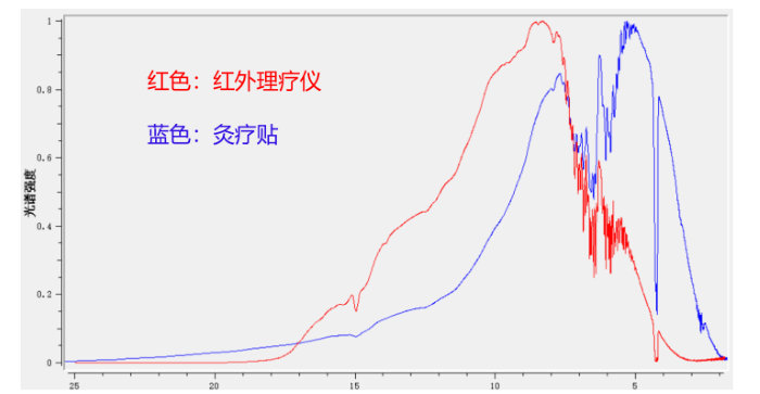 图3 340℃ 加热红外理疗仪和理疗贴的归一化发射光谱图比较