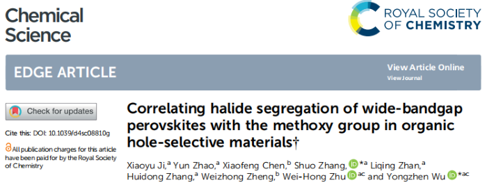 分享一篇来自华东理工大学吴永真团队的新研究成果,本文以“Correlating halide segregation of wide-bandgap perovskites with the methoxy group in organic hole-selective materials”为题发表于期刊Chemical Science。希望对您的科学研究或工业生产带来一些灵感和启发。