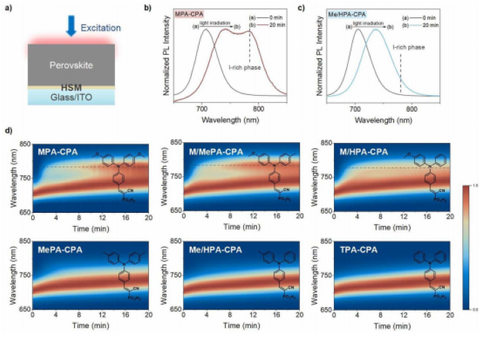 图1 (a)光致发光(PL)实验示意图。(b)在MPA-CPA和(c)在Me/HPA-CPA上沉积的1.76 eV钙钛矿在光照射20分钟后的光致发光光谱。(d)利用MPA-CPA、M/MePA-CPA、M/HPA-CPA、MePA-CPA、Me/HPA-CPA和TPA-CPA作为HSMs,跟踪1.76 eV钙钛矿在20分钟内的光致发光光谱变化。比例尺表示钙钛矿薄膜的归一化光致发光强度,虚线表示碘富相的出现。