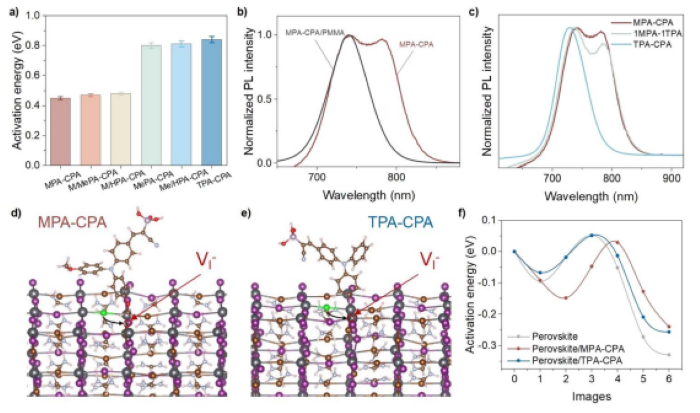 图2 (a)在不同HSMs上沉积的钙钛矿薄膜中PIHS的活化能。(b)在MPA-CPA或MPA-CPA/PMMA上沉积的钙钛矿在光照20分钟后的归一化PL强度。(c)在MPA-CPA和TPA-CPA混合HSMs上沉积的1.76 eV钙钛矿薄膜在光照20分钟后的PL光谱。(d)MPA-CPA/钙钛矿模型和(e)TPA-CPA/钙钛矿模型中包含卤素空位(VI)的初始界面结构,分子的MeO基团在表面顶部上方1.554 的高度。(f)DFT计算卤素离子迁移到相邻卤素空位的离子扩散活化能。