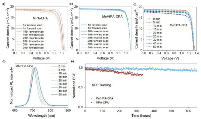 图3 (a)和(b)基于MPA-CPA和Me/HPA-CPA的器件在0.10 V s-1扫描速率下30次正反扫描周期的J–V曲线。(c)在光照条件下(氙灯,1个太阳),基于Me/HPA-CPA的器件在50分钟内J–V曲线和(d)PL光谱的变化。(e)在氮气条件下,基于MPA-CPA和Me/HPA-CPA的宽禁带钙钛矿太阳能电池(WBG-PSCs)的操作稳定性。其中,基于MPA-CPA和Me/HPA-CPA的WBG-PSCs的初始PCE分别为18.9%和20.3%。