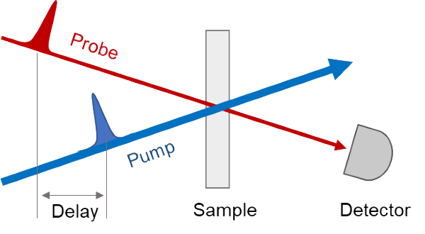 ,其中假设光以平面波沿着z轴传播,为其角频率,故而自然对数更能反映其本质。类似于大部分超快光谱技术,通常意义上的瞬态吸收是基于泵浦-探测(Pump-Probe)机制构建的技术,如图1所示。其中泵浦光为一束强脉冲激光,用于激发被测试材料;探测光为一束较弱的脉冲激光(通常功率密度小于泵浦光两个量级以上),用于探测材料被泵浦光瞬时激发之后的吸收度的变化。瞬态吸收光谱信号由有泵浦光与无泵浦光激发时探测光透过材料的吸收度相减获得,即: