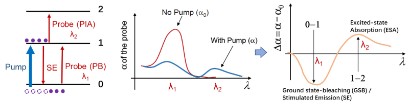 图2、飞秒瞬态吸收的主要过程和光谱特征。