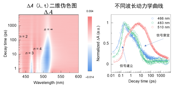此外,由于多粒子作用等造成的带隙重整、激子展宽变化、峰位移动等也是常见的瞬态吸收光谱特征信号,受篇幅限制不在这里展开讨论。