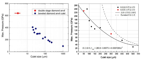 其中压力(P)的单位为GPa,压砧砧面直径(d)的单位为mm。该公式为设计不同砧面尺寸的高压实验提供了估算依据。下图汇总了国内外在不同金刚石砧面直径下所获得的*大实验压力[10-24]。