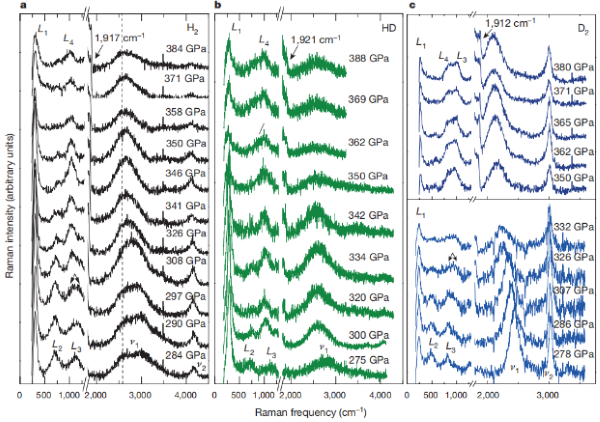 爱丁堡大学极端条件科学中心团队利用静态DAC与300K下的拉曼光谱,将H/HD加压至>325GPa,观测到振动模强度骤降、低频模消失及频率—压强斜率突变,首次确认新的V相。该相在388GPa及升温至465K后仍保持稳定,同时在D中发现IV′相,刷新了超高压实验记录并揭示了氢在分子-原子过渡前的行为。[29]