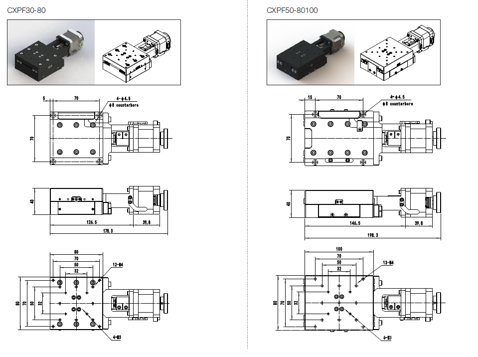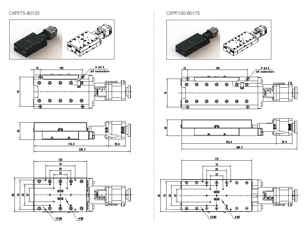 CXP 系列产品是卓立汉光为解决小尺寸、高使用频率等情况专门设计的高精密电动直线滑台。该系列产品主体材料采用硬质铝合金,表面黑色阳极氧化处理,耐磨性好、外型美观。产品采用交叉滚柱导轨,强度高、负载能力强、耐用性好,配合导轨面精密加工技术,使该系列产品具有较高的运动精度。驱动机构采用进口滚珠丝杠(1mm 导程),标配二相步进电机,可提供较高的微步能力和定位精度。该系列产品非常适合集成在对空间、尺寸、重量要求较高的自动化设备、精密仪器设备中,也比较适合使用在运动范围较小、往复频率高的工业生产线中。CXPF 系列产品是在CXP 结构的基础上,采用2mm 导程的滚珠丝杠,更换尺寸更大的交叉滚柱导轨,可实现更快速度,更高刚性。CXPF系列产品适合在较大行程、高精度的要求下,对速度和刚性有更高要求的情况下使用。