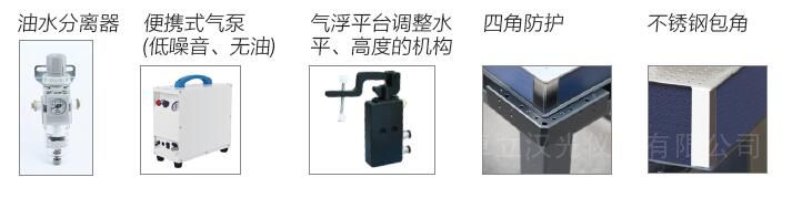气浮支架采用三线摆技术与层流阻尼技术,气室为二层结构,采用整体焊接四支撑结构。固有频率:垂直方向<1.5~2.5Hz;水平方向<1~1.5Hz。隔振效率:垂直方向:5Hz时:75~92%,10Hz时:90%~95%;水平方向:5Hz时:88~94%,10Hz时:92%~98%。3个水平调节阀反应灵敏,响应时间短,水平重复精度:±0.5mm。调整高度机构分为两部分:支架下方(每个支撑腿下方)具有高度调整机构,可解决地面不平引起的支架扭曲、变形等现象。支架上方采用三个特有的高度调整机构,可以调整高度和台面水平,平台自带四角防护板,具有台面气浮高度指示功能,调节更便捷。支架自带脚轮,方便移动和调整。