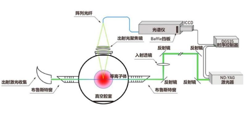 等离子体中心到透镜的距离L和光纤的芯径,及像斑决定了收集透镜的焦距。举例如下:如果像斑要求是fP =2mm,光纤芯径400mm, 则物像比是4,如果L=320mm, 则透镜的焦距就是320/4=80mm。同时如果观测的等离子体范围是50mm,那光纤一字排开的范围就是50mm/4=12.5mm。这个宽度和连接谱仪一侧的光纤束的尺寸很接近了,连接收集透镜一侧光纤也应该是密集排布,这样两端容纳的光纤数量就是匹配的。