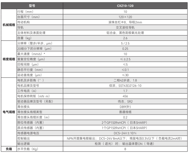 CXZ 系列电动升降滑台是北京卓立汉光仪器有限公司为解决小尺寸、高重复使用频率等情况专门设计的电动升降滑台。 该系列产品主体材料采用硬质铝合金,表面黑色阳极氧化处理,耐磨性好、外型美观。导轨采用交叉滚柱,强度高、负载能力强、耐用性好。采用滚珠丝杠传动,标配二相步进电机,可提供较高的分辨率和重复定位精度。该系列产品非常适合集成在对空间、尺寸 重量要求较高的自动化设备、精密仪器设备等中,也比较适合使用在运动范围较小、往复频率高的工业生产线中。