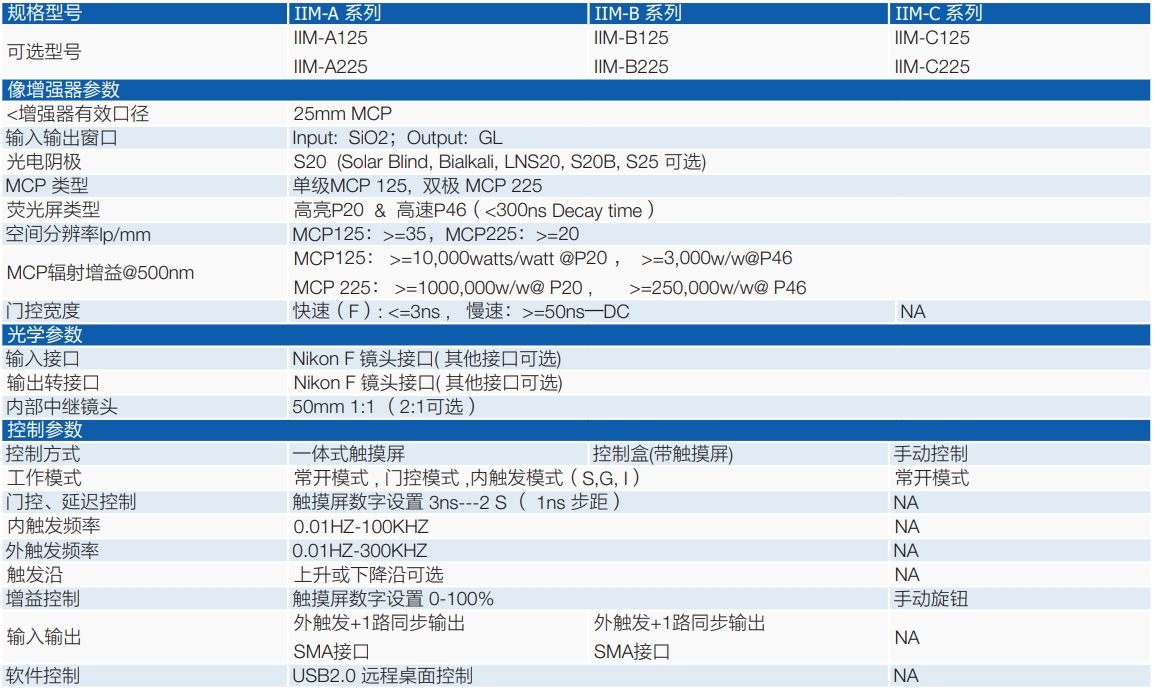 IIM系列像增强模组,深度契合客户实际应用,根据应用场景可分为A/B/C 三大结构设计,内部全部采用高度一体化结构设计, 耦合25mm大靶面像增强器,可以提供光电转换,增益控制以及高速快门功能,专门特殊设计用来通过Nikon -F或C接口安装到用户已有的CCD 相机,EMCCD ,sCMOS或高速相机上面,也可以体用光谱仪拓展转接口,完成高速光谱或弱光光谱采集。