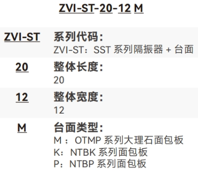 ZVI-ST系列钢弹簧主动隔振平台命名规则选型表:(M、K、P参考具体台面信息)
