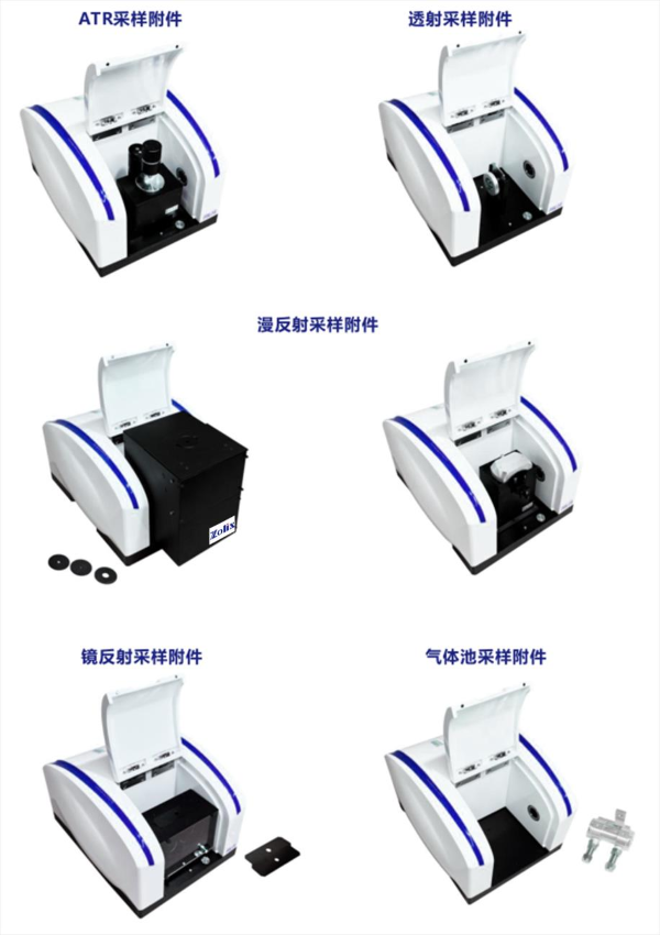 可配置8000-350 cm-1(常规KBr版本)光谱分辨率 优于0.9cm-1 波数精度 优于0.01cm-1 干涉仪 国产高稳定立体角镜干涉仪,恒久准直,使用寿命大于10年 分束器 镀锗KBr分束器,专为中红外区优化设计(硒化锌防潮版可选) 检测器 可快速响应的热释电检测器 红外光源 高能量中红外氮化硅光源;用户可自行更换 激光器 固体激光器,使用寿命大于10年 接口 网络接口 电源 100-240V;50-60Hz 密闭干燥系统 具有良好的密封防潮性能,软件实时显示仪器内部温度和湿度数值,并有湿度自动报警功能,底板上有可再生的旋拧干燥管。 尺寸 17cm×39.5cm×22.3cm 适用附件